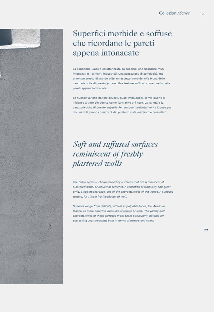 La collezione Calce è caratterizzata da superfici che ricordano muri