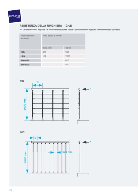 D = Distanza massima fra paletti / F = Resistenza strutturale statica a carico orizzontale applicato uniformemente sul corrimano