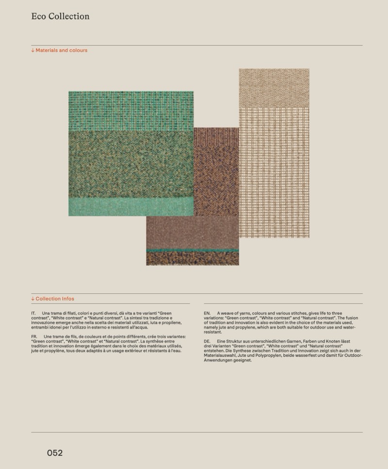 IT. Una trama di filati, colori e punti diversi, dà vita a tre varianti “Green