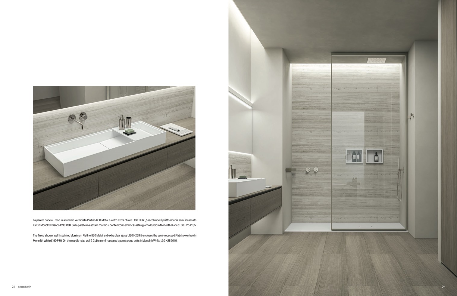 The Trend shower wall in painted aluminum Platino 860 Metal and extra clear glass L130 H268.5 encloses the semi-recessed Flat shower tray in