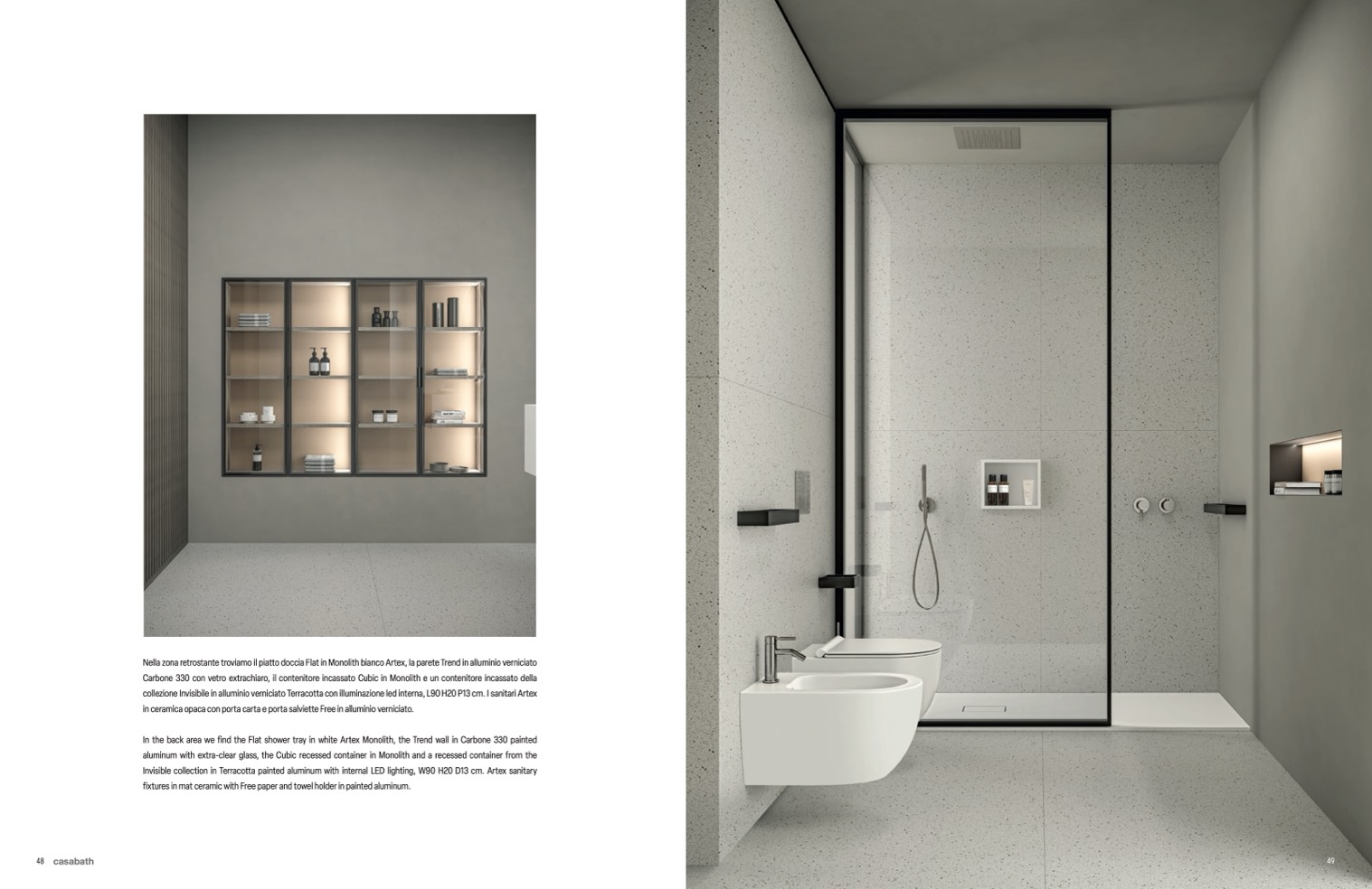 In the back area we find the Flat shower tray in white Artex Monolith, the Trend wall in Carbone 330 painted