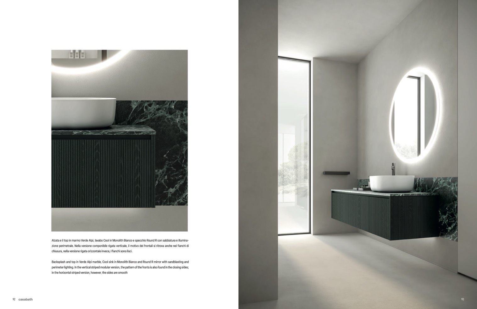 Backsplash and top in Verde Alpi marble, Cool sink in Monolith Bianco and Round R mirror with sandblasting and