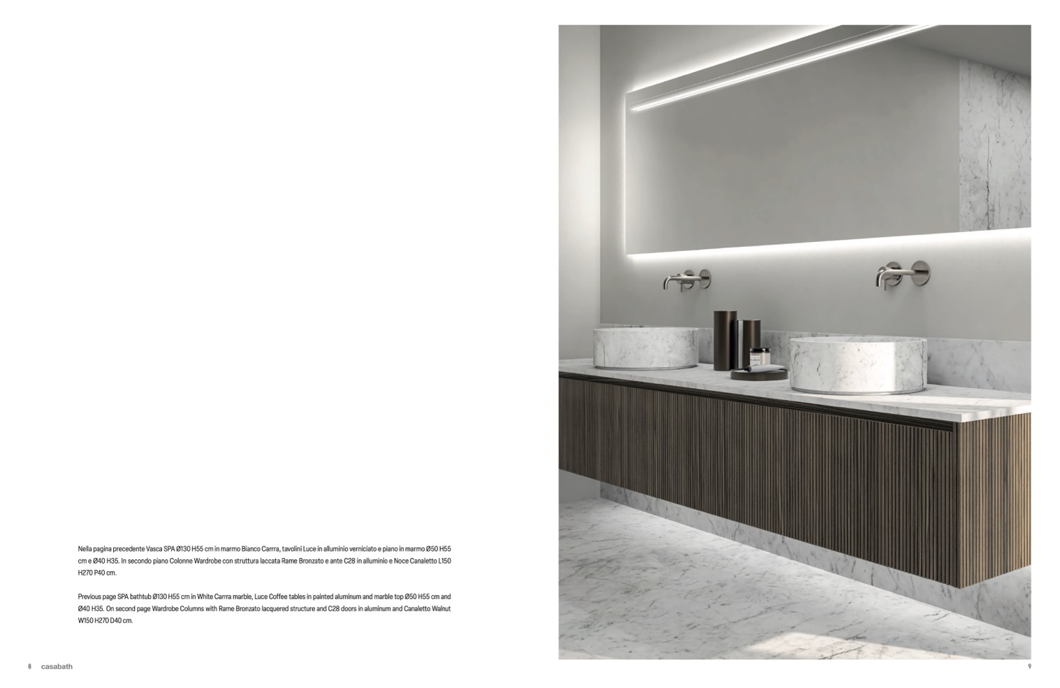 Previous page SPA bathtub Ø130 H55 cm in White Carrra marble, Luce Coffee tables in painted aluminum and marble top Ø50 H55 cm and