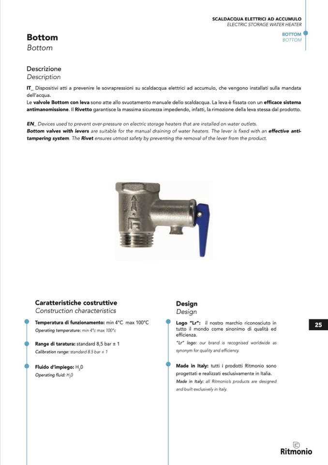 Le valvole Bottom con leva sono atte allo svuotamento manuale dello scaldacqua. La leva è fissata con un efficace sistema