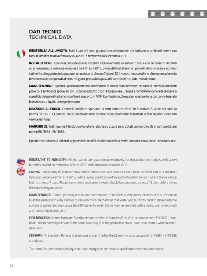 RESISTENZA ALL’UMIDITÀ. Tutti i pannelli sono garantiti esclusivamente per l’utilizzo in ambienti interni con