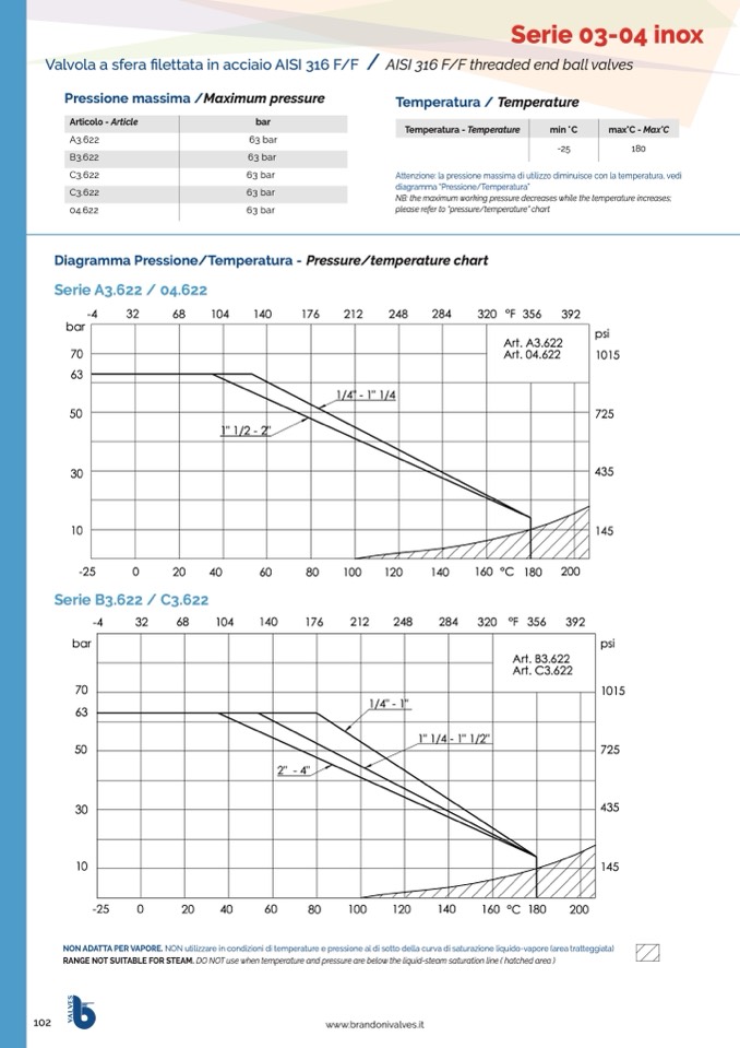 NOT SUITABLE FOR STEAM. DO NOT use with temperature and pressure conditions placed below the liquid - steam saturation line (hatched area)