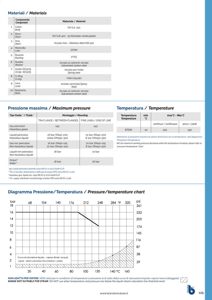 Attenzione: la pressione massima di utilizzo diminuisce con la temperatura, vedi diagramma