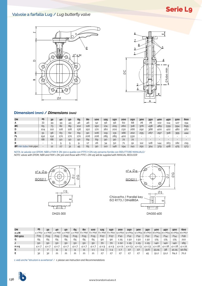 NOTE: valves with EPDM, NBR and FKM ≥ DN 300 and those with PTFE ≥ DN 125 will be supplied with MANUAL REDUCER