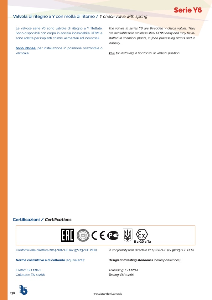 Le valvole serie Y6 sono valvole di ritegno a Y filettate.