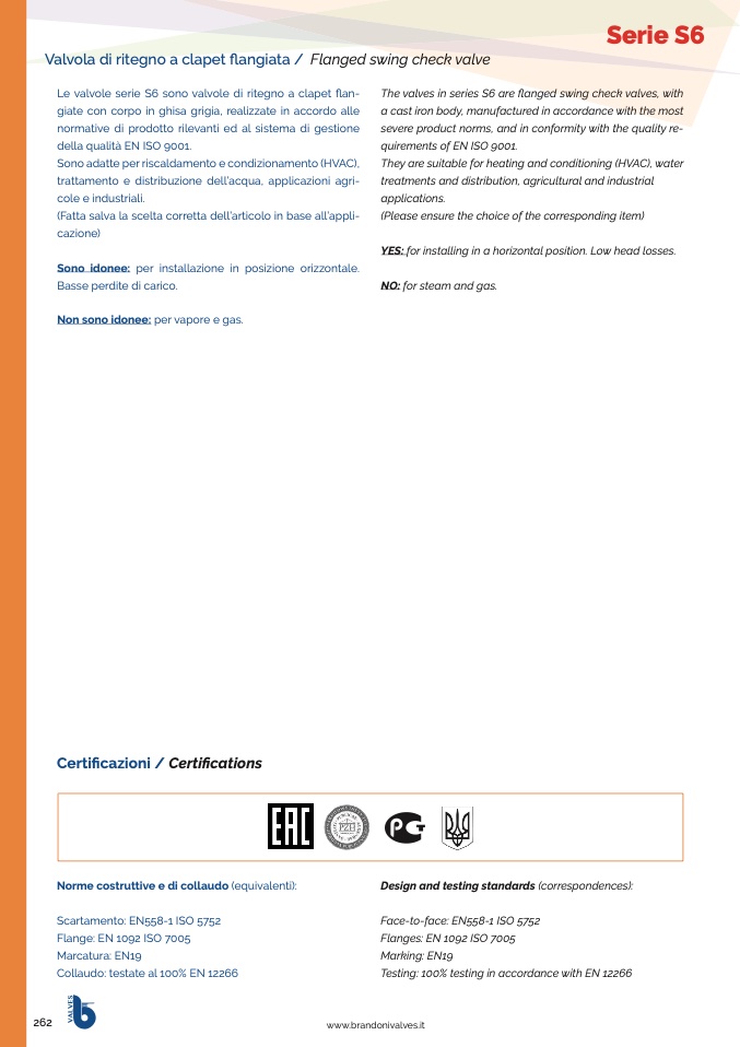 Le valvole serie S6 sono valvole di ritegno a clapet flan-