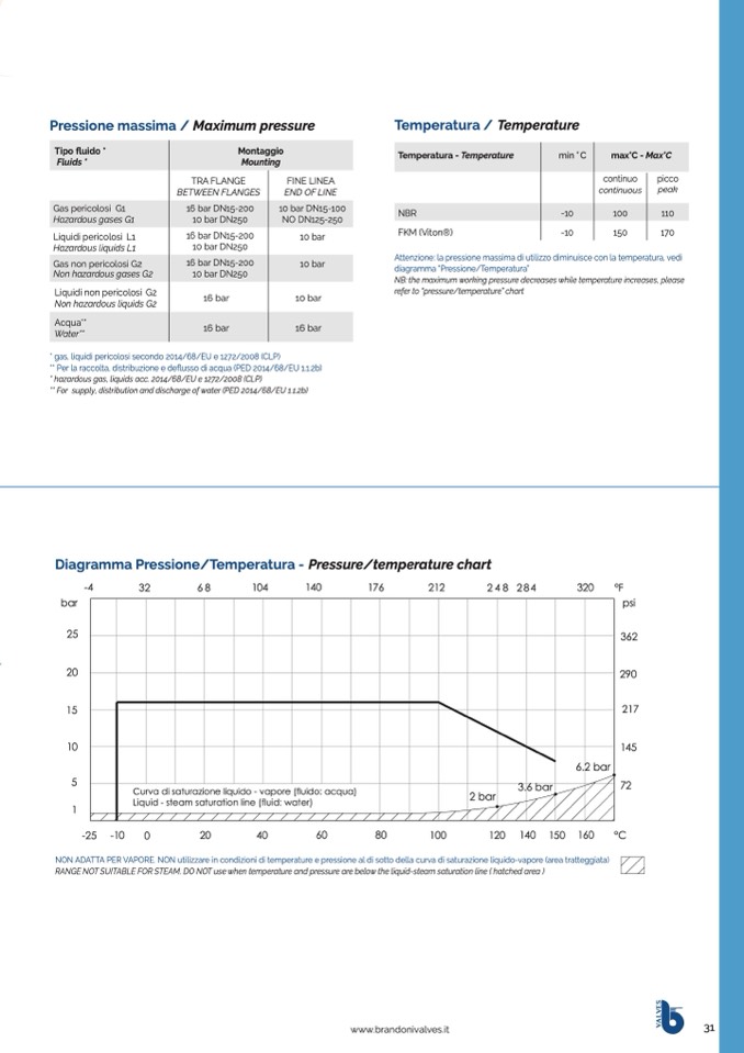 Attenzione: la pressione massima di utilizzo diminuisce con la temperatura, vedi