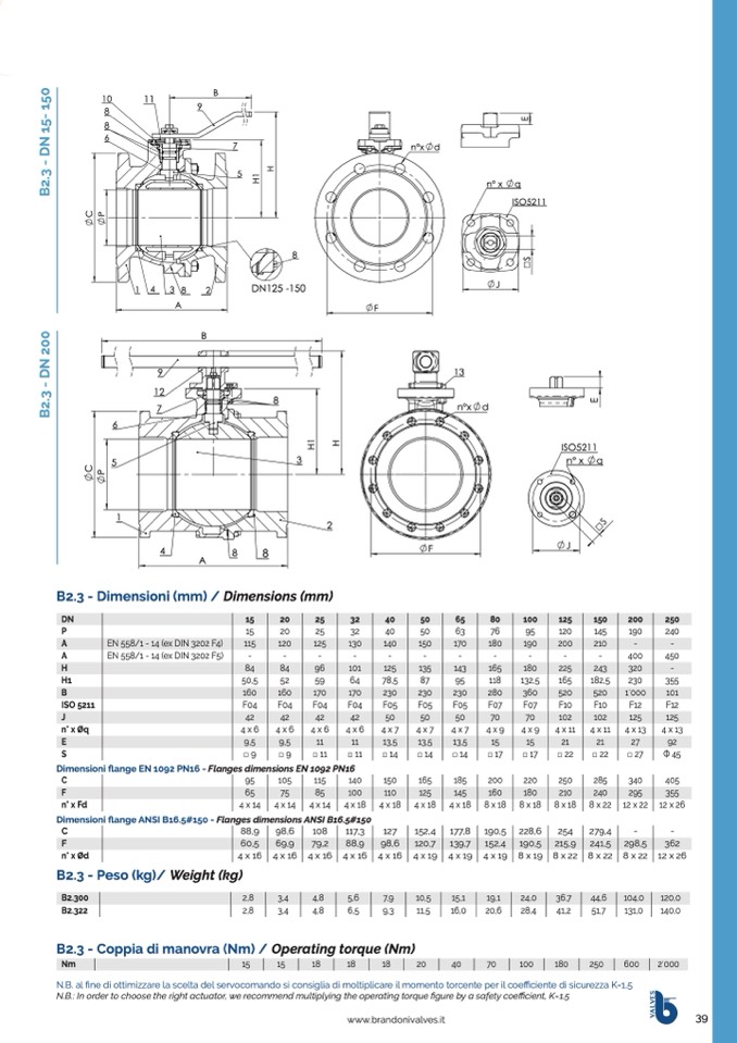 N.B.: In order to choose the right actuator, we recommend multiplying the operating torque figure by a safety coefficient, K=1.5