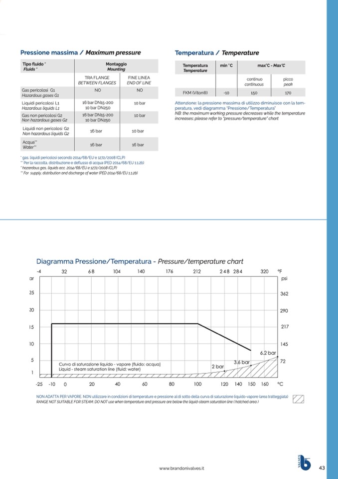 NON ADATTA PER VAPORE. NON utilizzare in condizioni di temperature e pressione al di sotto della curva di saturazione liquido-vapore (area tratteggiata)