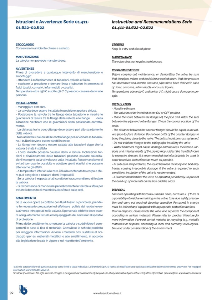 Brandoni SpA reserves the right to make changes in design and/or construction of the products at any time without prior notice. For further information, please refer to www.brandonivalves.it