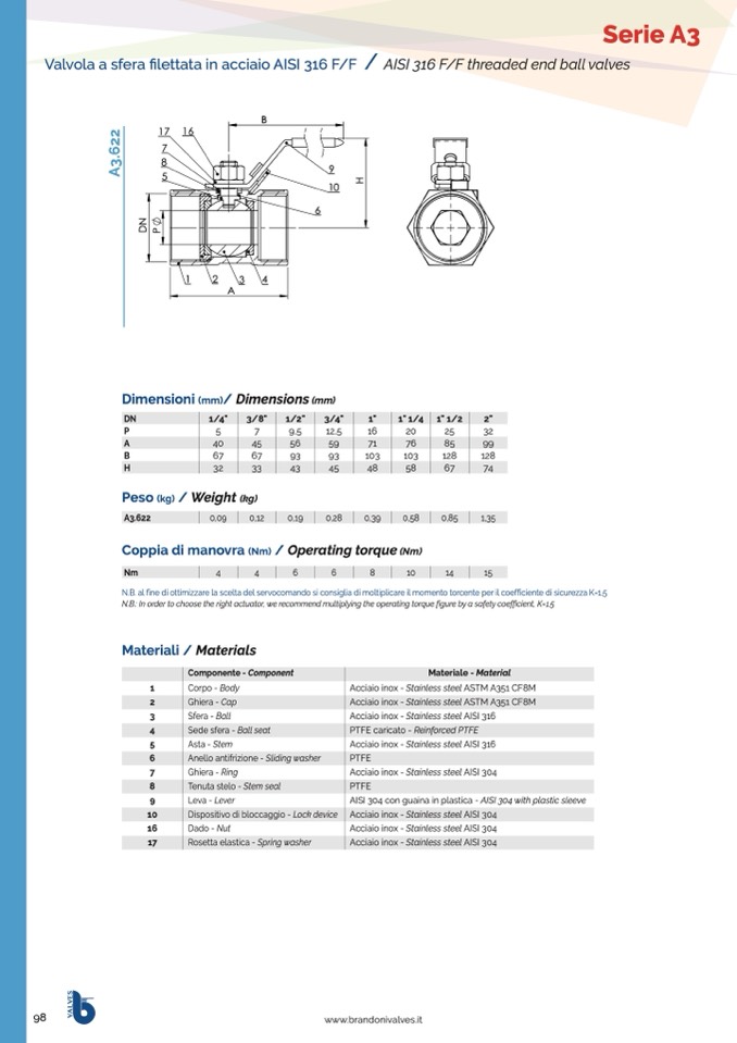 N.B.: In order to choose the right actuator, we recommend multiplying the operating torque figure by a safety coefficient, K=1.5