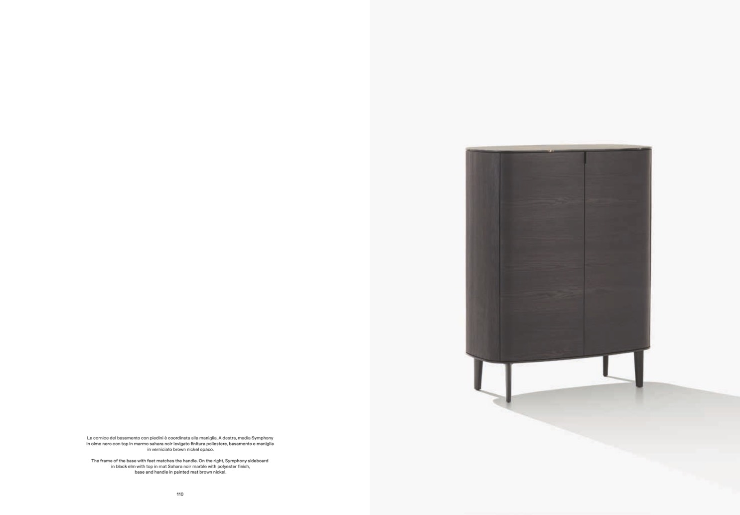 La cornice del basamento con piedini è coordinata alla maniglia. A destra, madia Symphony