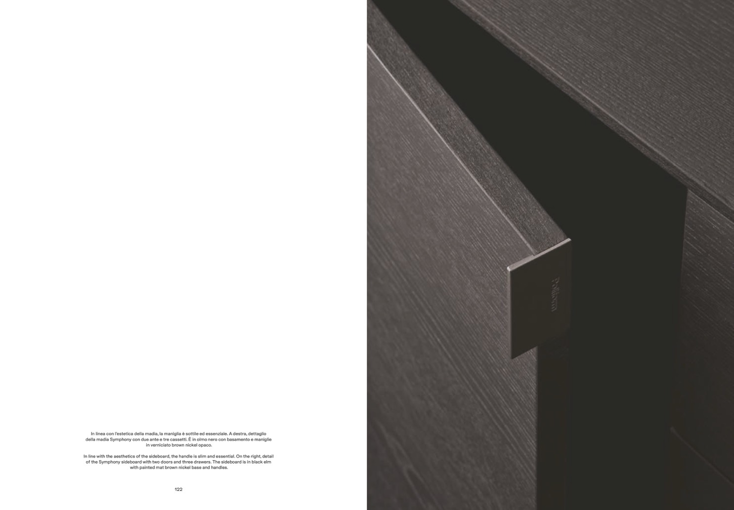 In linea con l’estetica della madia, la maniglia è sottile ed essenziale. A destra, dettaglio