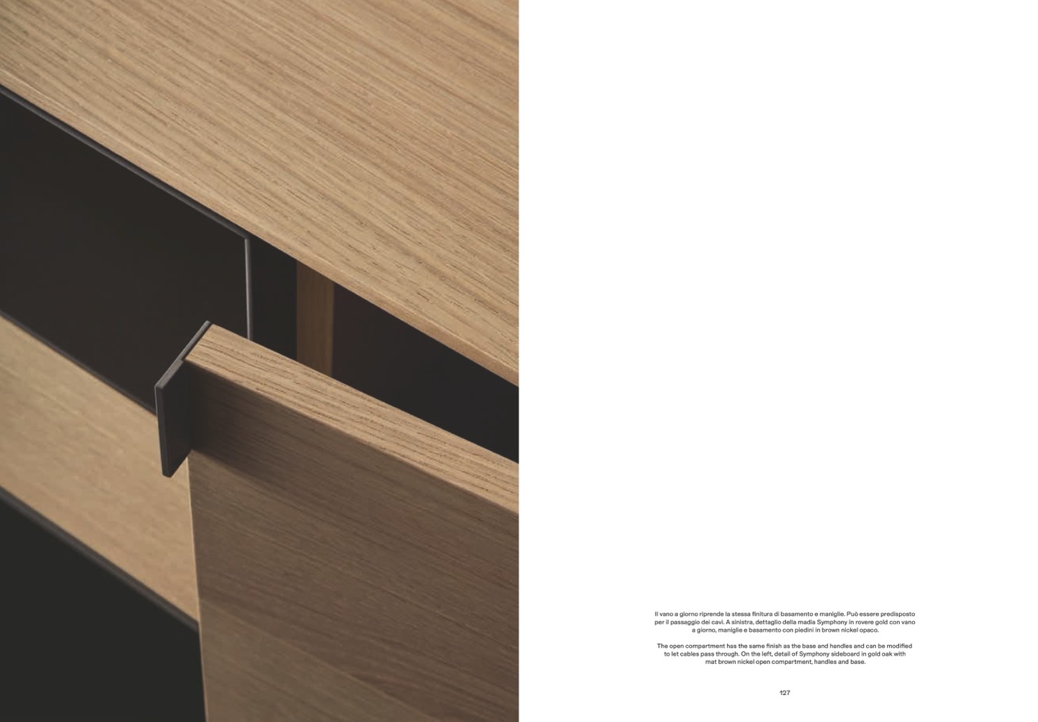 to let cables pass through. On the left, detail of Symphony sideboard in gold oak with