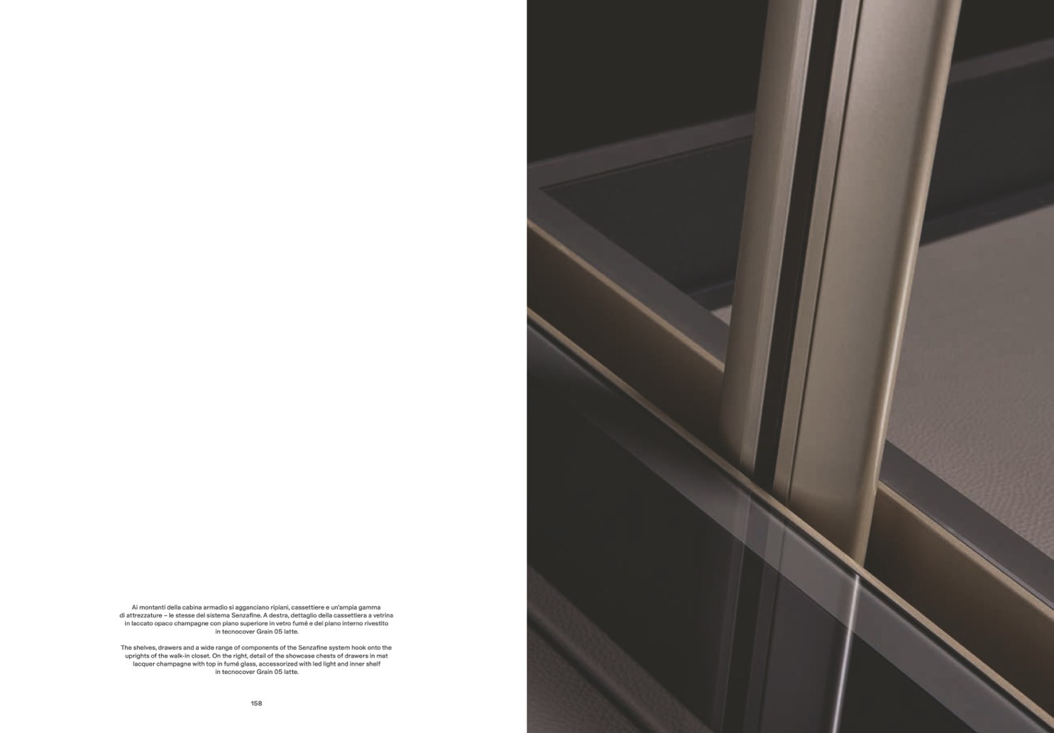 di attrezzature – le stesse del sistema Senzafine. A destra, dettaglio della cassettiera a vetrina
