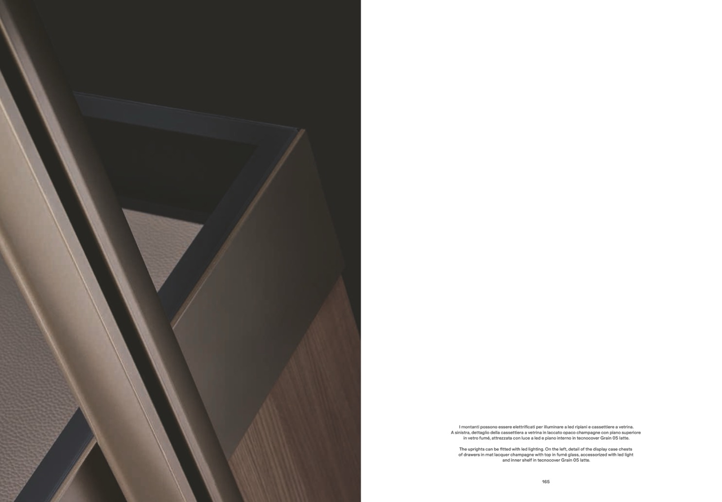 A sinistra, dettaglio della cassettiera a vetrina in laccato opaco champagne con piano superiore