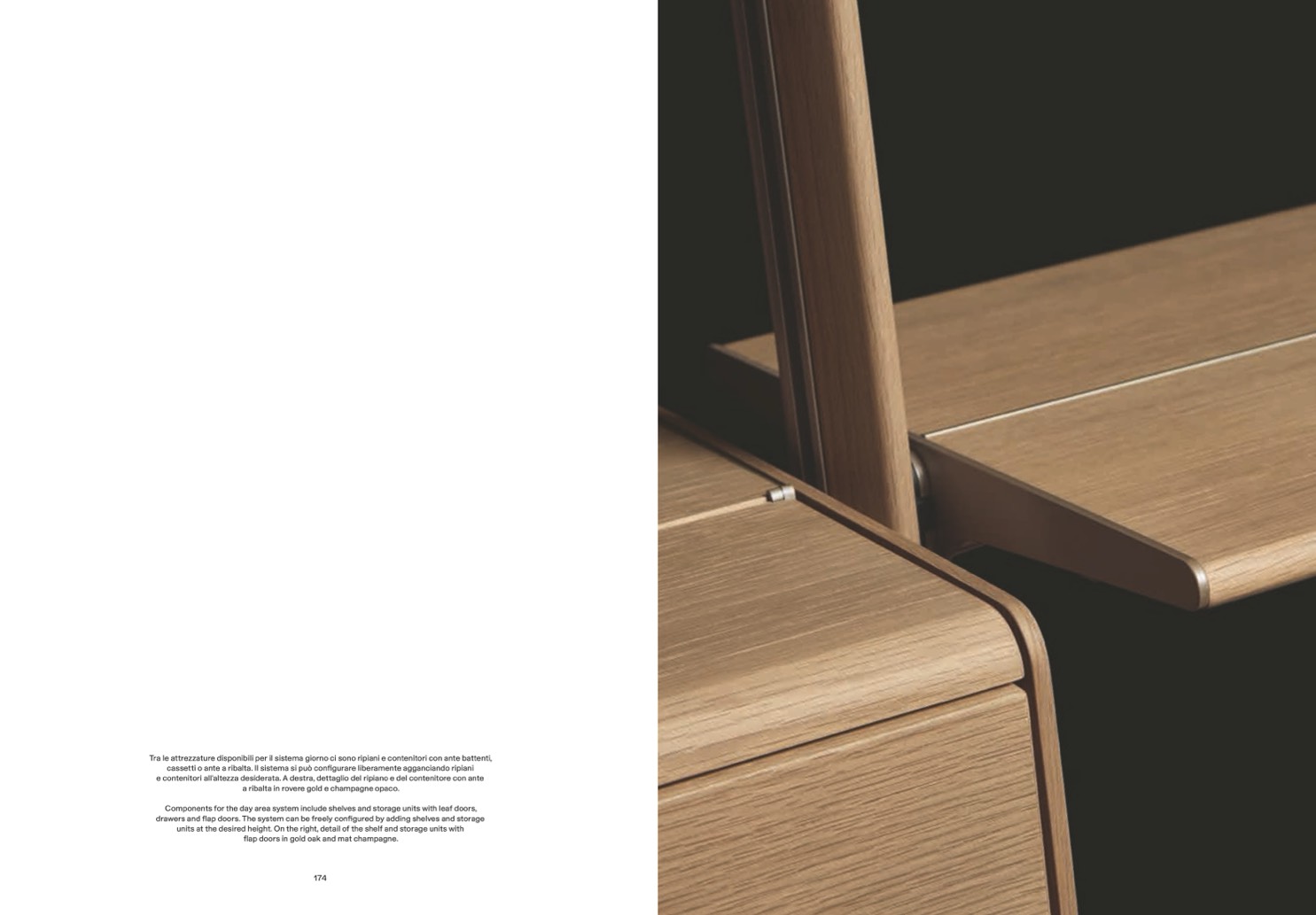 Tra le attrezzature disponibili per il sistema giorno ci sono ripiani e contenitori con ante battenti,