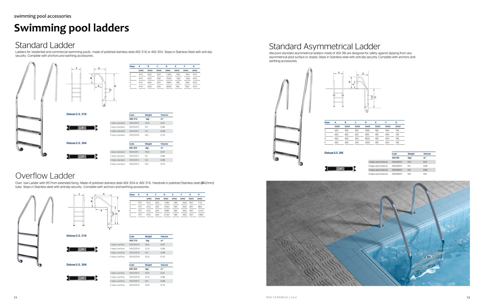 Atecpool standard asymmetrical ladders made of AISI 316 are designed for safety against slipping from any