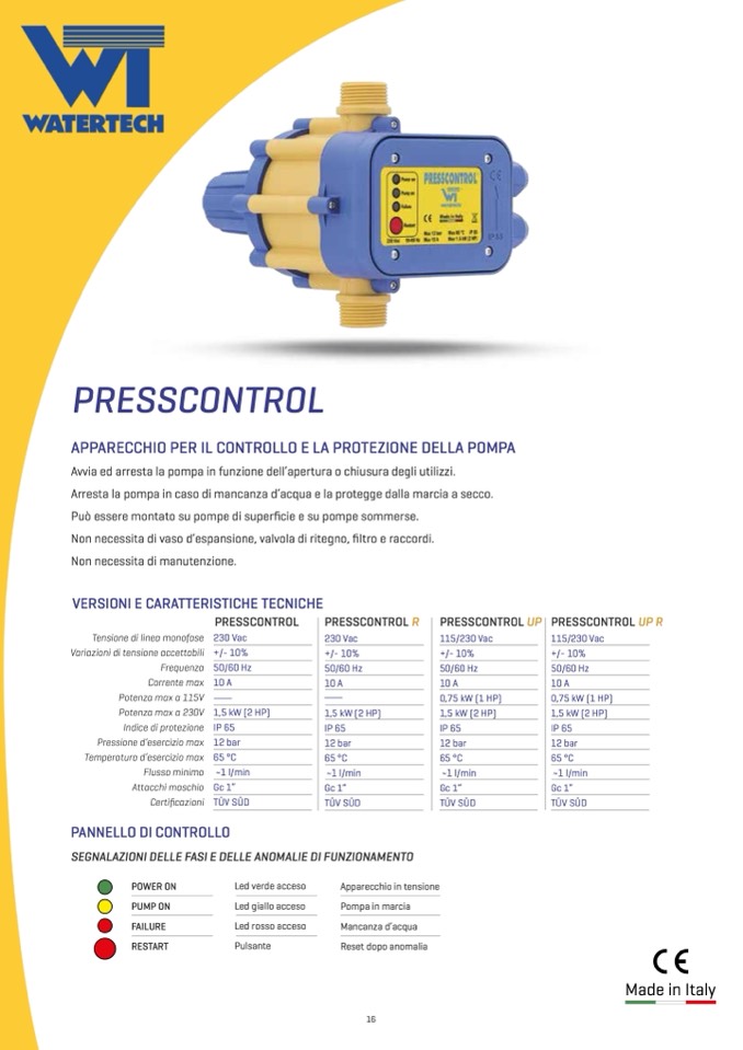 Arresta la pompa in caso di mancanza d’acqua e la protegge dalla marcia a secco.