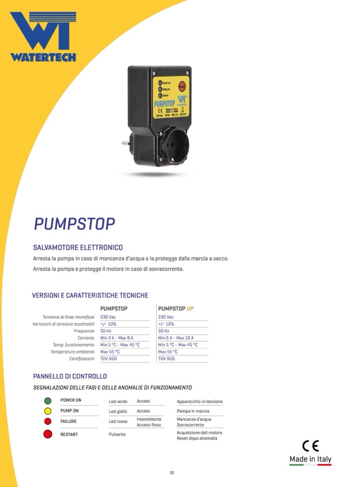 Arresta la pompa in caso di mancanza d’acqua e la protegge dalla marcia a secco.