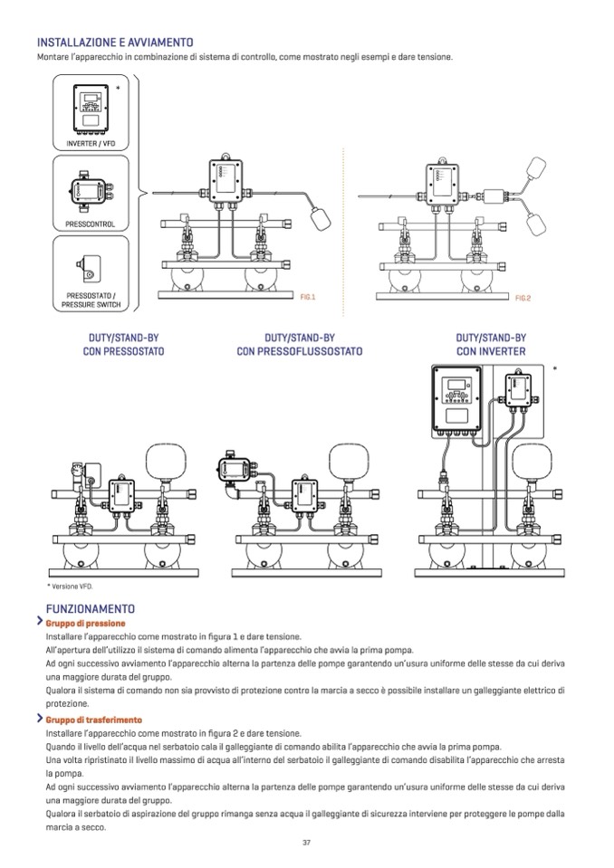 Quando il livello dell’acqua nel serbatoio cala il galleggiante di comando abilita l’apparecchio che avvia la prima pompa.