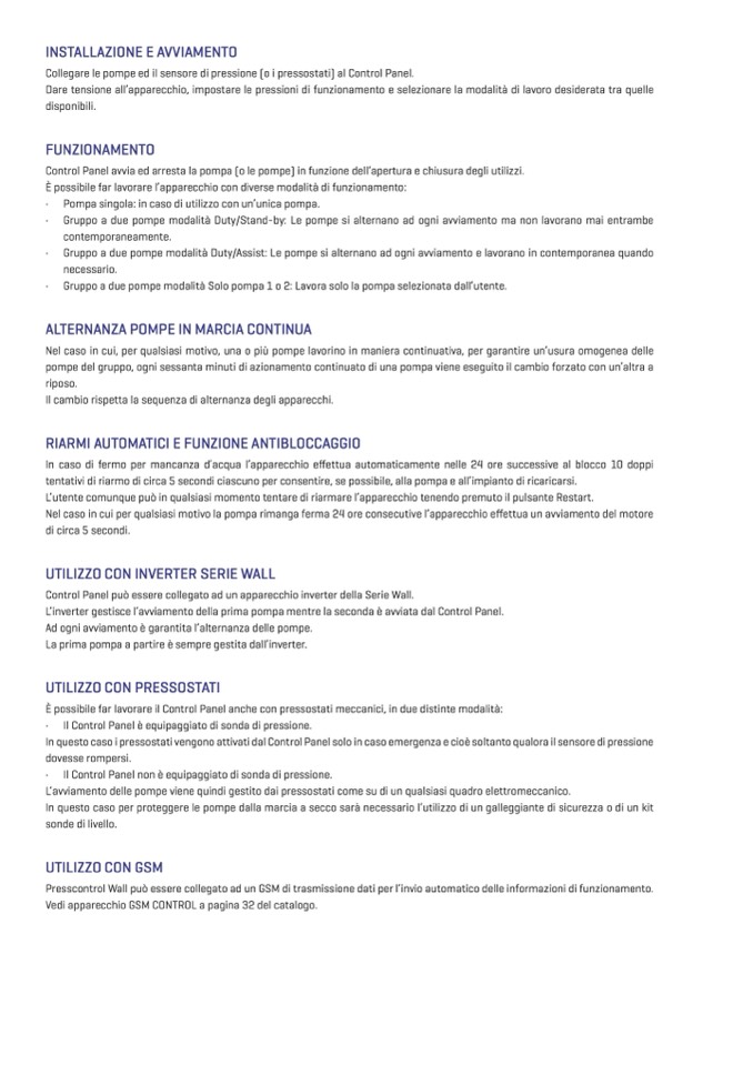 Control Panel avvia ed arresta la pompa (o le pompe) in funzione dell’apertura e chiusura degli utilizzi.