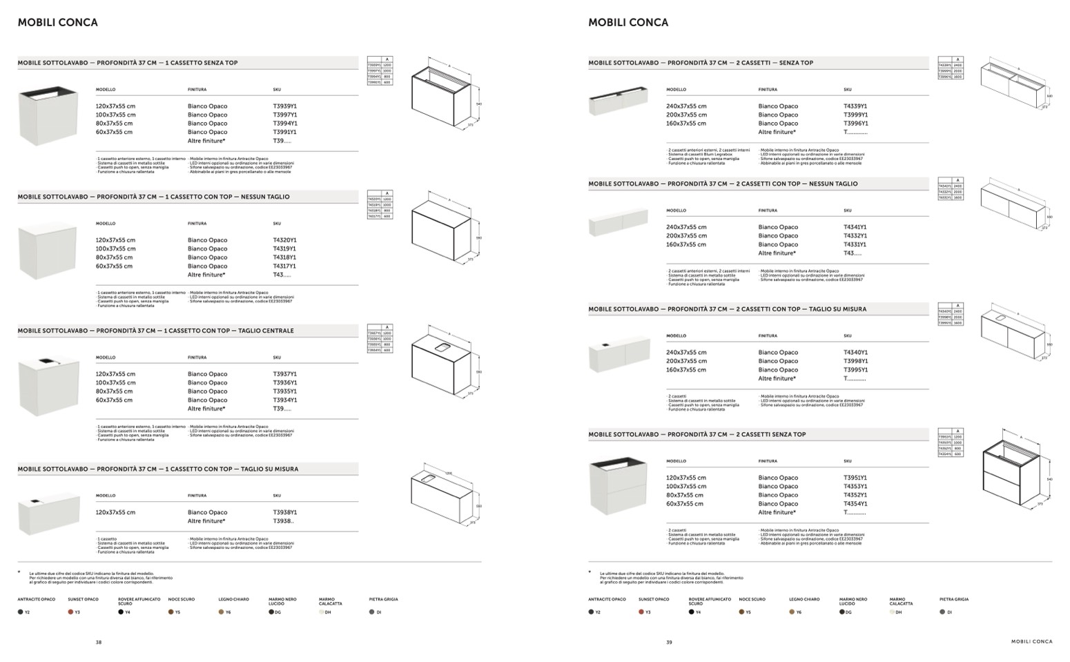MOBILE SOTTOLAVABO — PROFONDITÀ 37 CM — 2 CASSETTI CON TOP — NESSUN TAGLIO