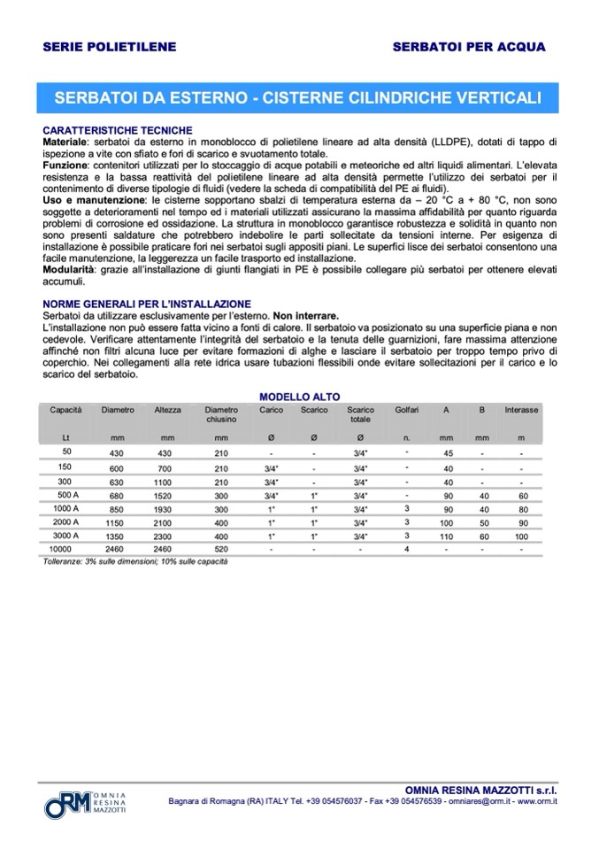 Materiale: serbatoi da esterno in monoblocco di polietilene lineare ad alta densità (LLDPE), dotati di tappo di