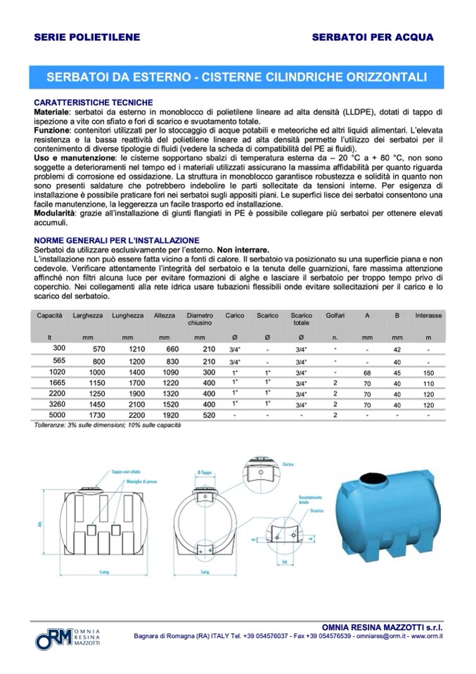Materiale: serbatoi da esterno in monoblocco di polietilene lineare ad alta densità (LLDPE), dotati di tappo di