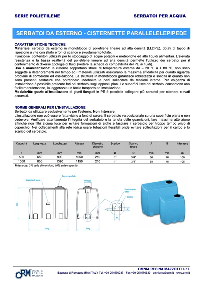 Materiale: serbatoi da esterno in monoblocco di polietilene lineare ad alta densità (LLDPE), dotati di tappo di