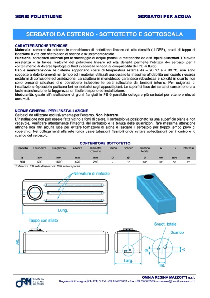 Materiale: serbatoi da esterno in monoblocco di polietilene lineare ad alta densità (LLDPE), dotati di tappo di