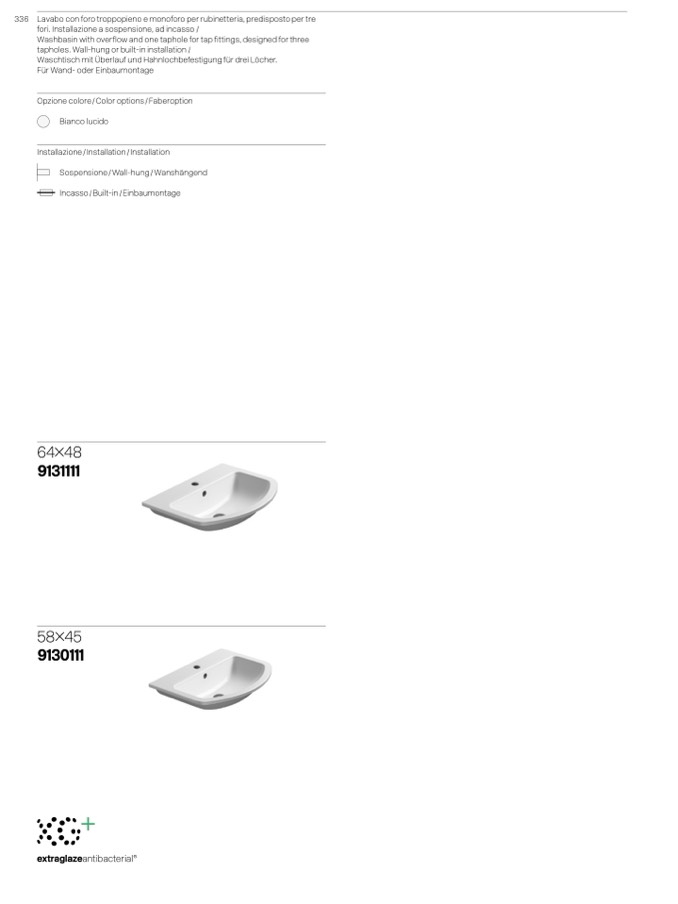 336 Lavabo con foro troppopieno e monoforo per rubinetteria, predisposto per tre