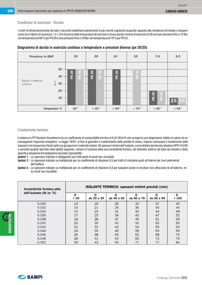 conto di un fattore di sicurezza 1,3-1,9 in funzione delle temperature di esercizio e di una durata minima di esercizio di 50 anni per pressioni fino a 10 Bar