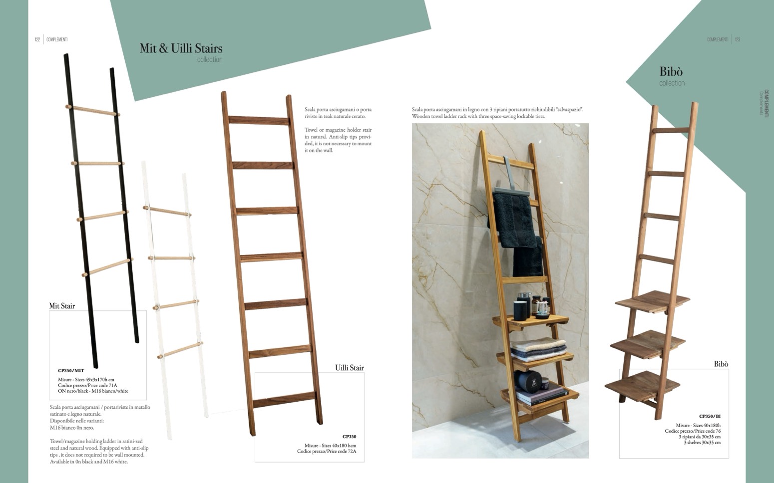 Scala porta asciugamani in legno con 3 ripiani portatutto richiudibili “salvaspazio”.