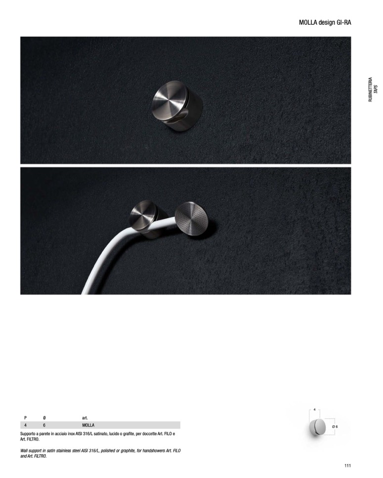 Supporto a parete in acciaio inox AISI 316/L satinato, lucido o grafite, per doccette Art. FILO e