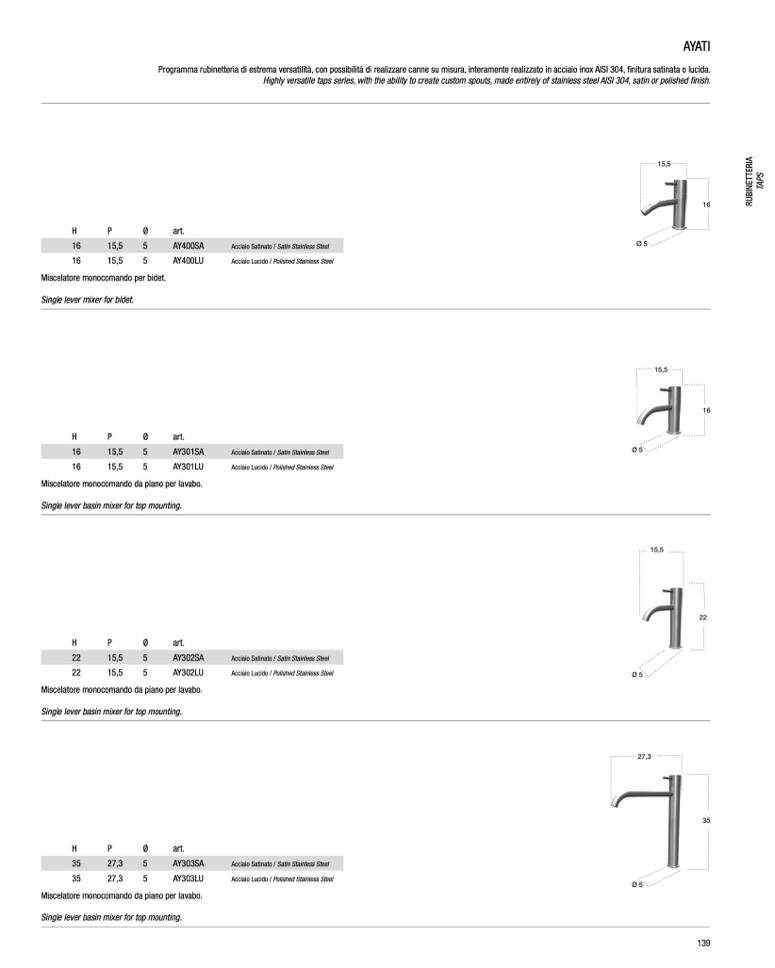 Highly versatile taps series, with the ability to create custom spouts, made entirely of stainless steel AISI 304, satin or polished finish.