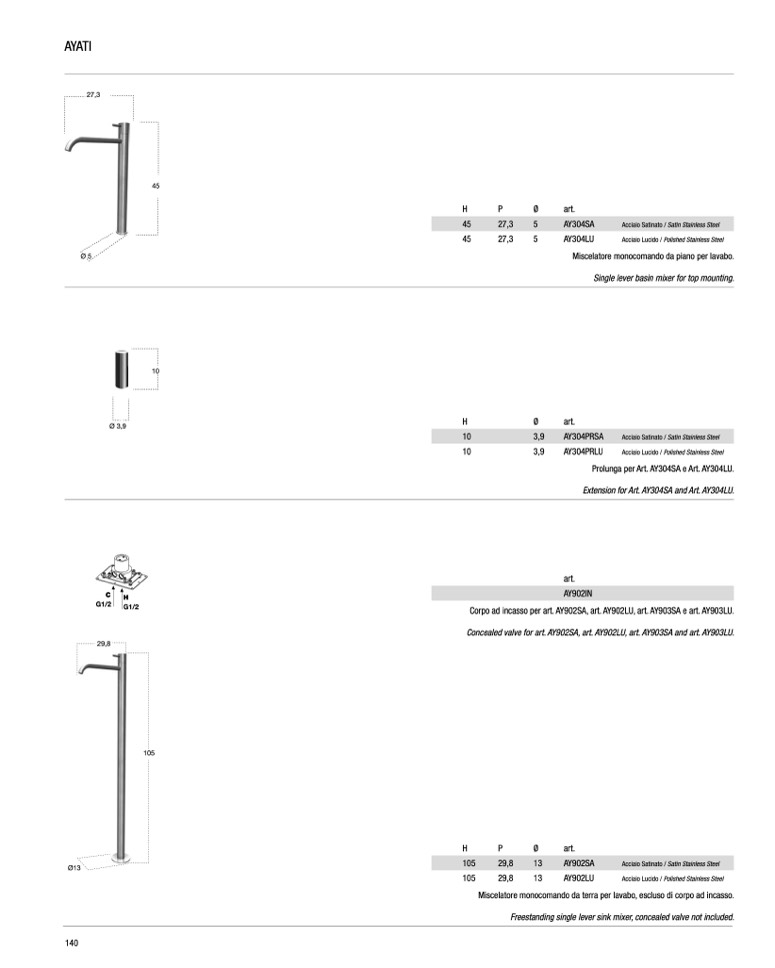 Concealed valve for art. AY902SA, art. AY902LU, art. AY903SA and art. AY903LU.