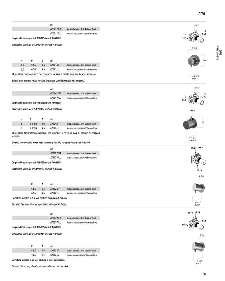 Concealed valve for art. AY603SA and art. AY603LU.