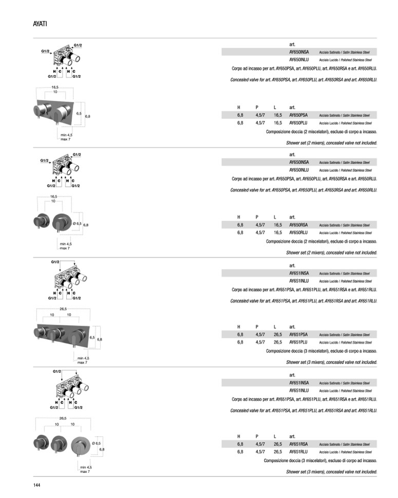 Concealed valve for art. AY650PSA, art. AY650PLU, art. AY650RSA and art. AY650RLU.