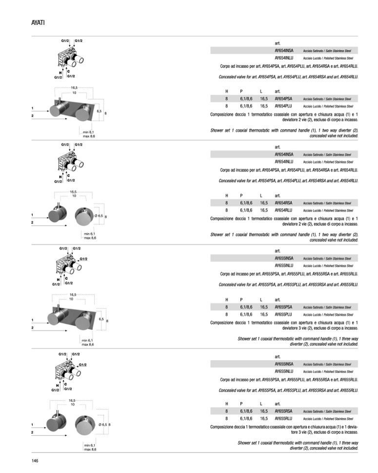 Concealed valve for art. AY655PSA, art. AY655PLU, art. AY655RSA and art. AY655RLU.
