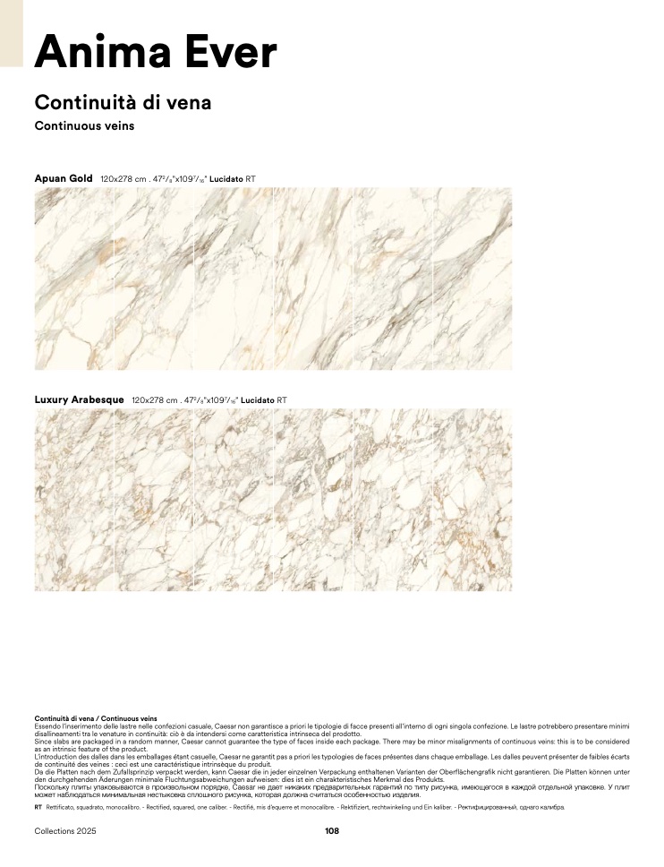 Since slabs are packaged in a random manner, Caesar cannot guarantee the type of faces inside each package. There may be minor misalignments of continuous veins: this is to be considered