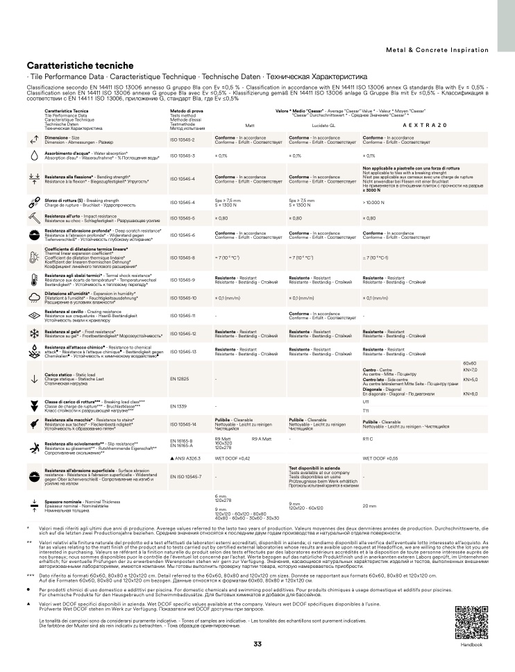 Classificazione secondo EN 14411 ISO 13006 annesso G gruppo BIa con Ev ≤0,5 % - Classification in accordance with EN 14411 ISO 13006 annex G standards BIa with Ev ≤ 0,5% -