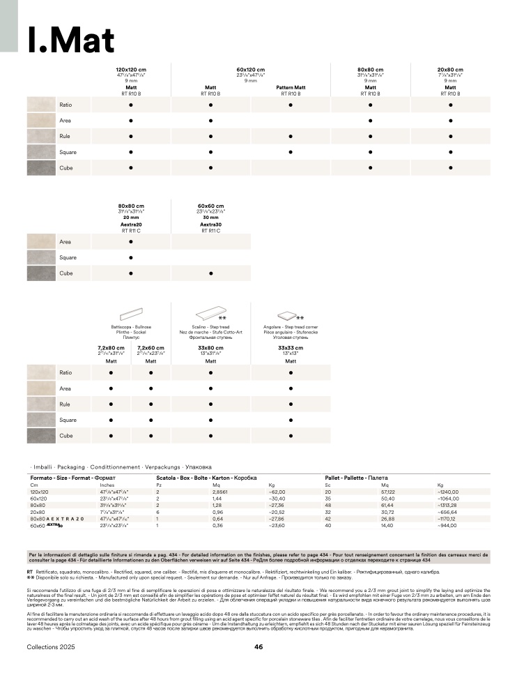 Per le informazioni di dettaglio sulle finiture si rimanda a pag. 434 - For detailed information on the finishes, please refer to page 434 - Pour tout renseignement concernant la finition des carreaux merci de