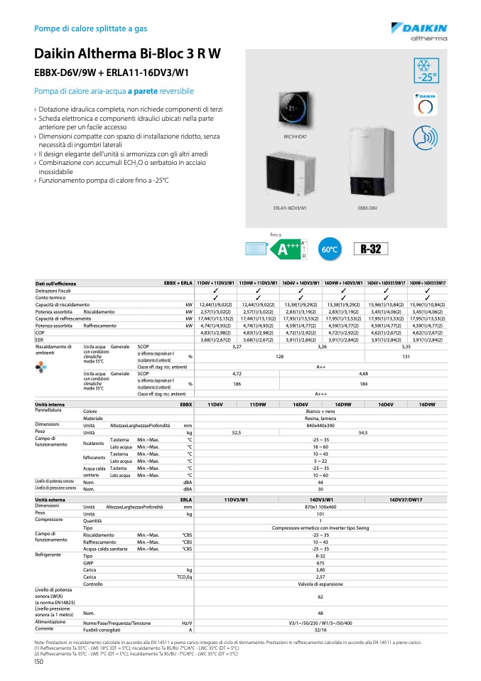 Note: Prestazioni in riscaldamento calcolate in accordo alla EN 14511 a pieno carico integrato di ciclo di sbrinamento. Prestazioni in raffrescamento calcolate in accordo alla EN 14511 a pieno carico.