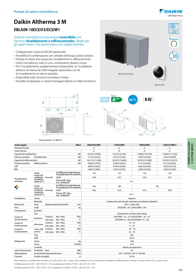 (2) Raffrescamento Ta 35°C - LWE 7°C (DT = 5°C); riscaldamento Ta BS/BU -7°C/6°C - LWC 35°C (DT = 5°C)