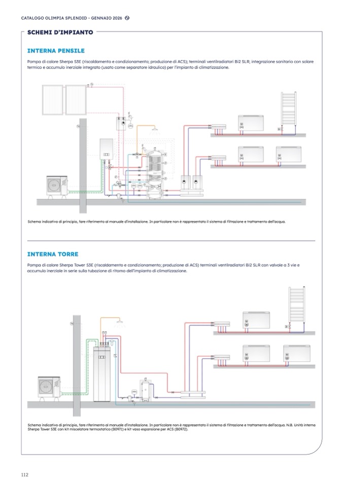 Pompa di calore Sherpa S3E (riscaldamento e condizionamento; produzione di ACS); terminali ventilradiatori Bi2 SLR; integrazione sanitario con solar